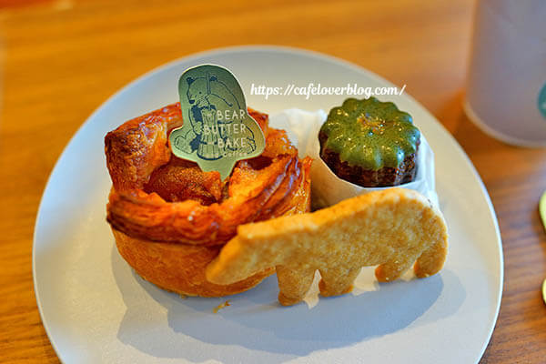 人気2位だというりんごのパイと、抹茶味のカヌレがあったので思わずそちらも。牛さん型のクッキーは、店内利用の場合にサービスで付くとのことでした。かわいらしいですね~!