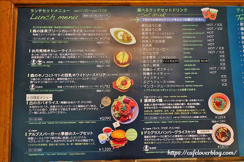 洋食中心のランチと、和スイーツ&お茶が中心のラインナップ。担々麺などヴィーガン対応のメニューもあります。