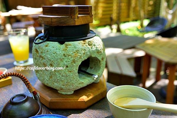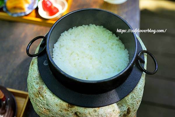 ご飯は目の前に釜がセットされて炊かれます。南部鉄器と大谷石を組み合わせた釜だそう。